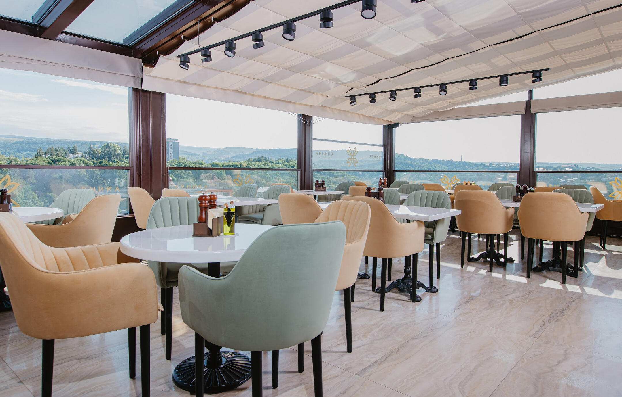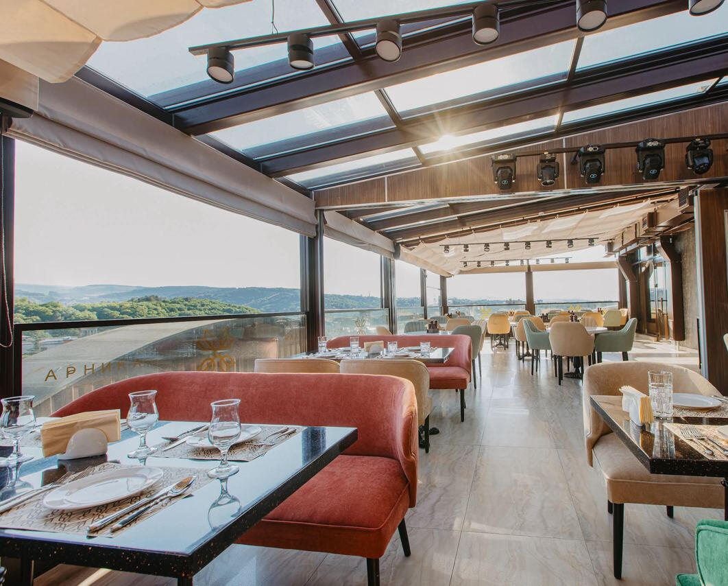 Зал Арника расположен на крыше с обзорным видом на город и индивидуальным меню на основе местных фермерских продуктов. Роскошь и гармония в каждом блюде
