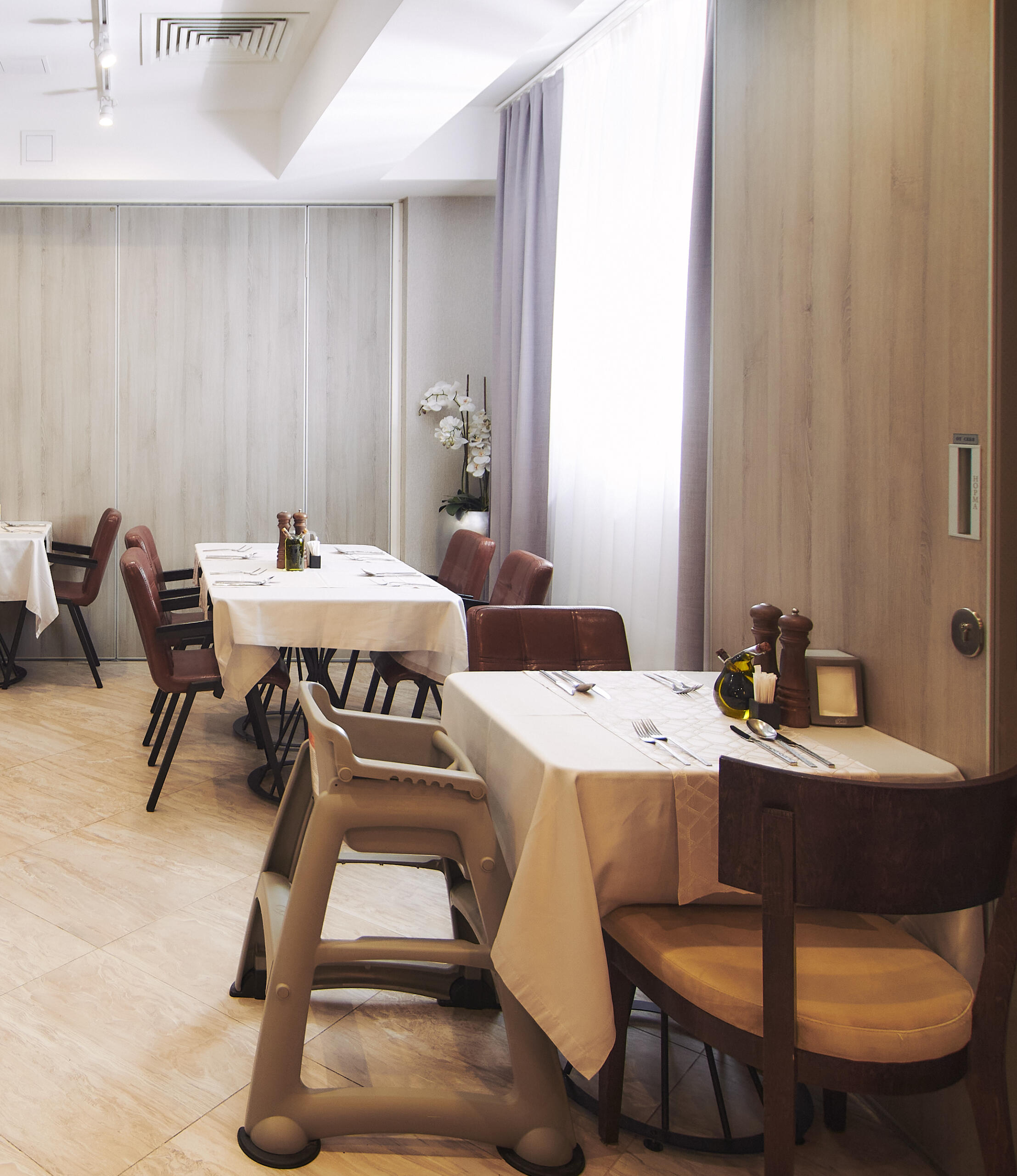Первый этаж, уютная атмосфера и специальное меню для гостей с детьми. Детские стульчики, омлетная станция с пышными омлетами, свежий салат-бар и мини-бар с полезными напитками.